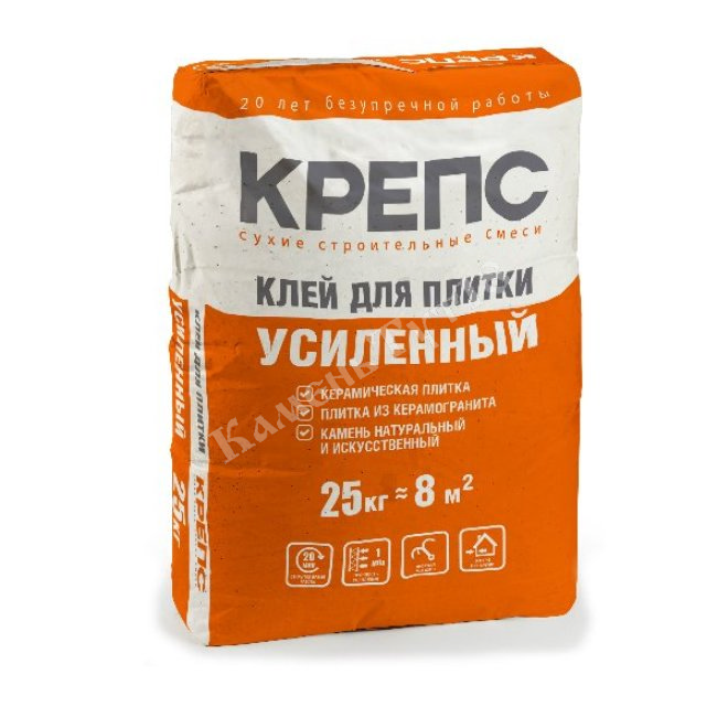 Клей КРЕПС "Усиленный" предназначен для укладки керамической плитки, плитки из керамогранита, натурального и искусственного камня на стены и пол, в том числе обогреваемый, при выполнении внутренних и наружных работ на следующие основания:
