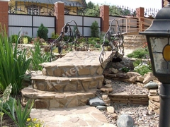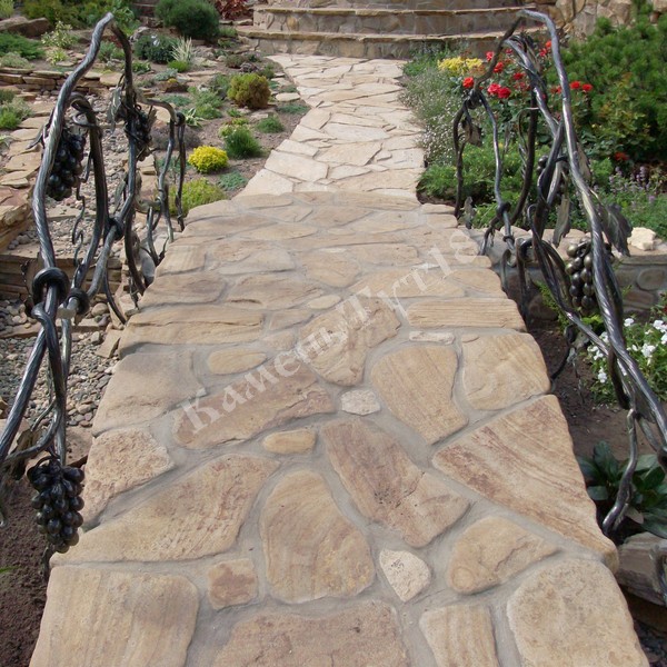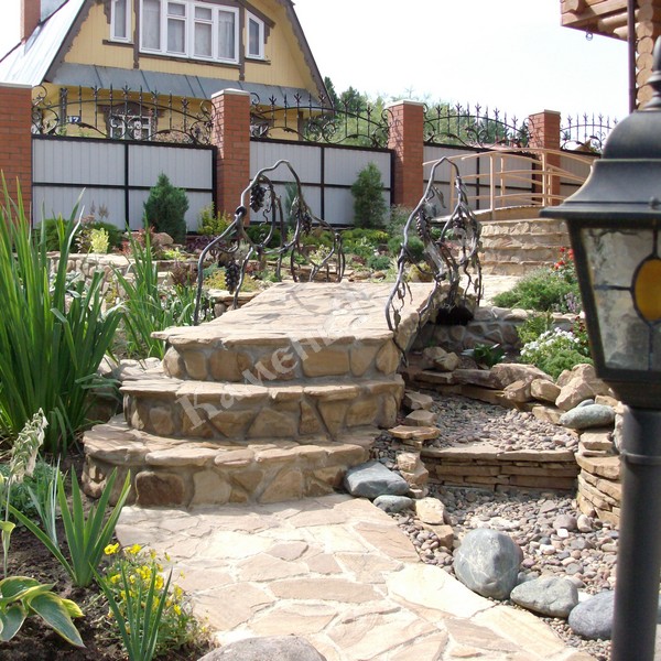 Внешний вид позволяет облицовывать им фасады зданий, цоколя. Песчаник отлично подходит для укладки в дорожки из природного камня. Такой камень используют для декорирования бассейнов, прудов, фонтанов и других мини водоемов.