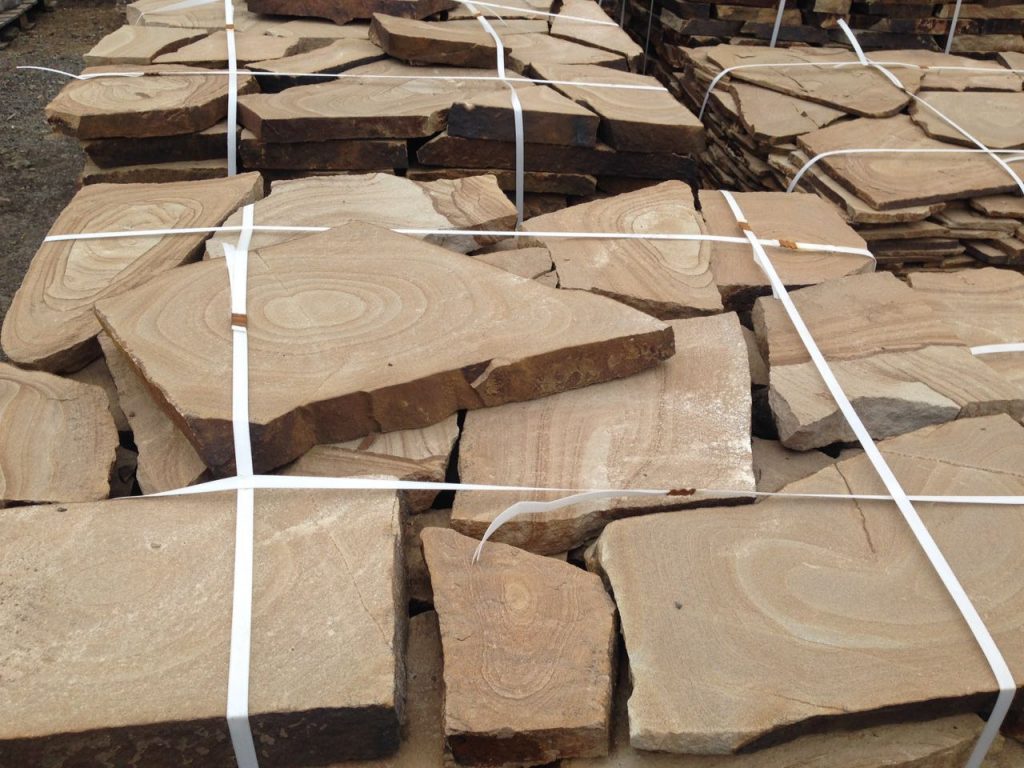 Внешний вид позволяет облицовывать им фасады зданий, цоколя. Песчаник отлично подходит для укладки в дорожки из природного камня. Такой камень используют для декорирования бассейнов, прудов, фонтанов и других мини водоемов.