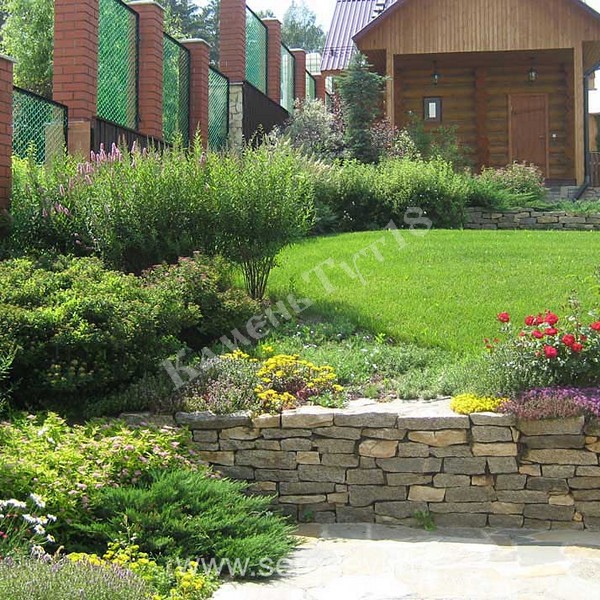 Сам камень выступает не как облицовочный, а как фундаментальный материал, из которого выполняется вся конструкция. Часто для придания натурального вида между камнями засыпают грунт и высаживают стелющиеся растения.