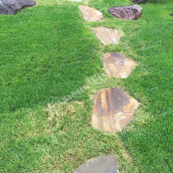 Плиты из Песчаника желто-коричневые отлично подходят для укладки в дорожки из природного камня, а также для декорирования бассейнов, прудов, фонтанов и других мини водоемов.